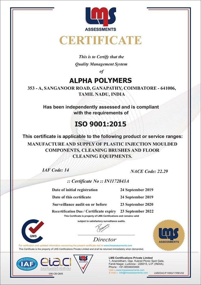 Alpha Polymers was established in 1986 as a precision plastic molded component manufacturer. The precision molded components were used primarily in automobile, textile and electrical switchgear industries. We have diversified into the manufacture of cleaning brushes used in floor cleaning machines.